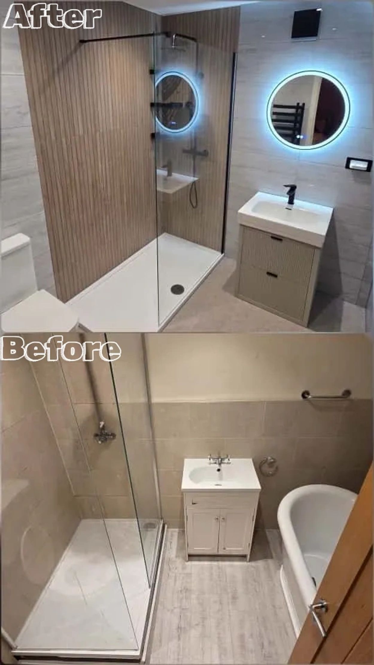 We replaced the old suite with a stylish shower enclosure, stone-effect feature tiles, modern vanity unit, and fresh flooring — making the most of every inch with a sleek, updated design.